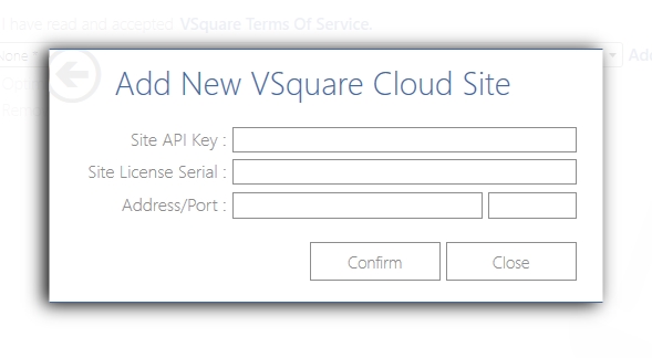 Clicking on the Add Cloud Site button will open a new dialog requesting your Cloud Site API Key, your License Serial Number and the Address/Port of the remote cloud site.