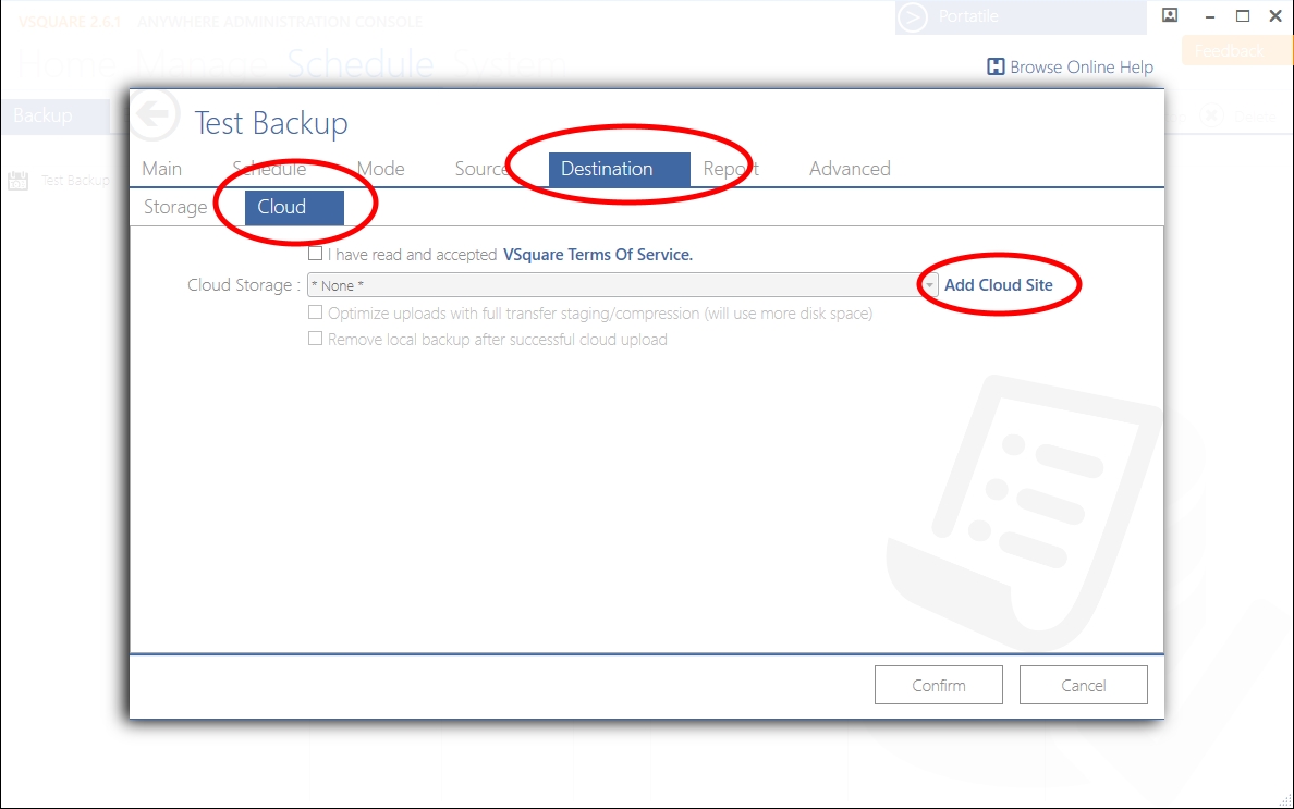 Once your VSquare Cloud Site has been installed and configured, you can start registering it on all the VSquare Backup servers that should upload to it. To do so, you need to add the site as a cloud target under the cloud destination tab of your backupset. Once the Cloud Site has been configured for one backupset, it is immediately available to all backupset and disaster recovery schedules.