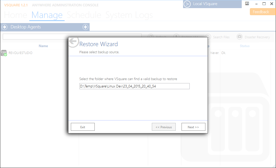 Restoring your data is quick and easy with VSquare Backup. Following the restore wizard you can restore a complete virtual machine or extract single files from a virtual disk.